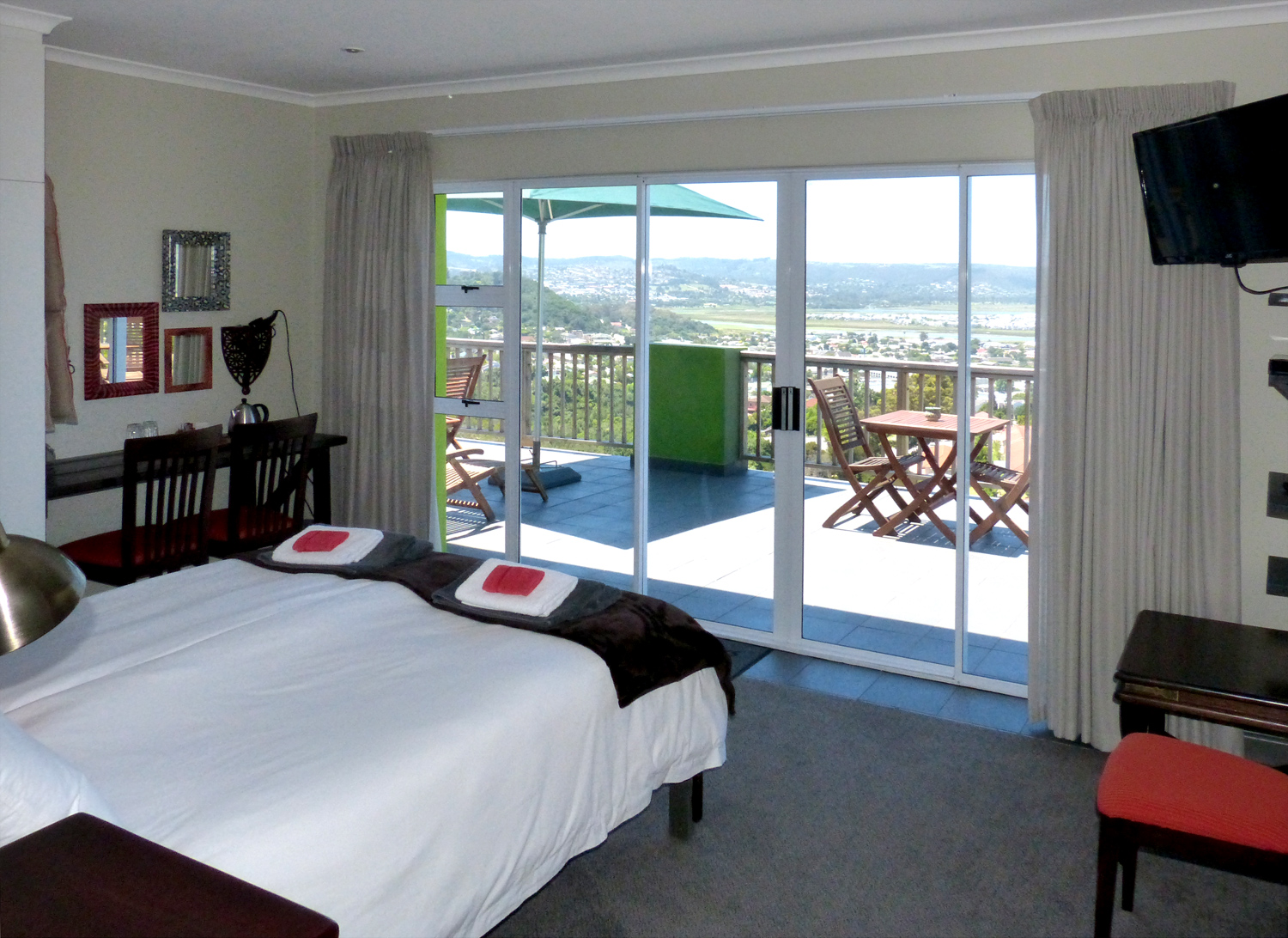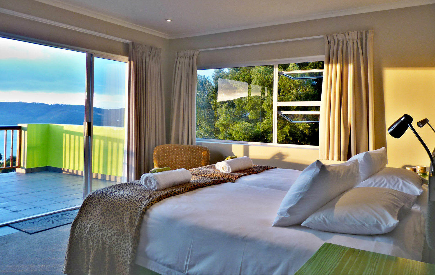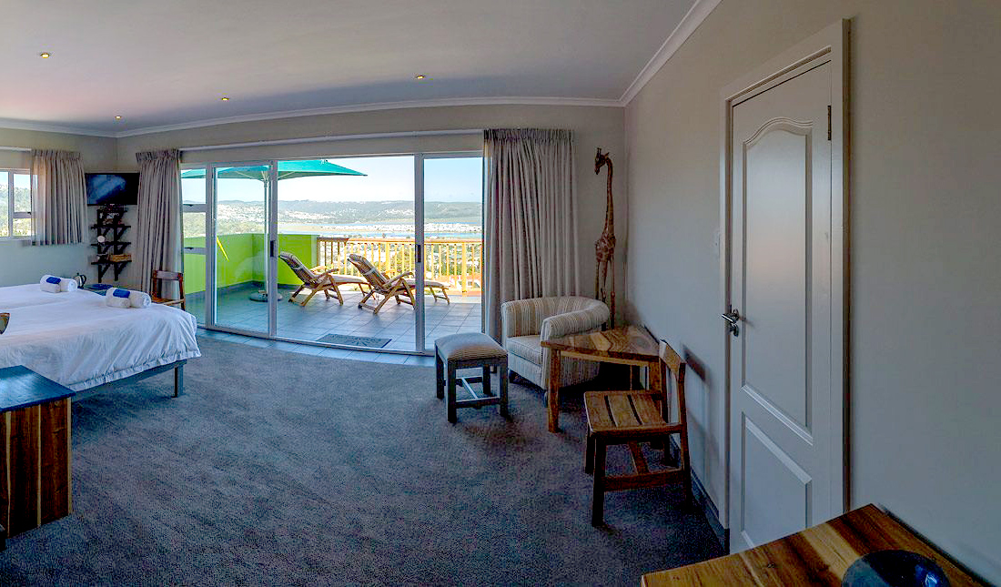 Die Besonderheit des Knysnaviews Guesthouses zeigt sich in seinem einzigartigen Gemisch aus gemütlichen, europäischen und afrikanischen Ambiente. Die 4 Superior Zimmer mit großer privater Terrasse und spektakulären Ausblick, gehobener Badausstattung, sind stilvoll eingerichtet und verfügen über kostenfreies Wi-Fi, digitale TV Kanäle, DVD player, Tee/Kaffestation, Wäscheservice, Safe, Haarfön.